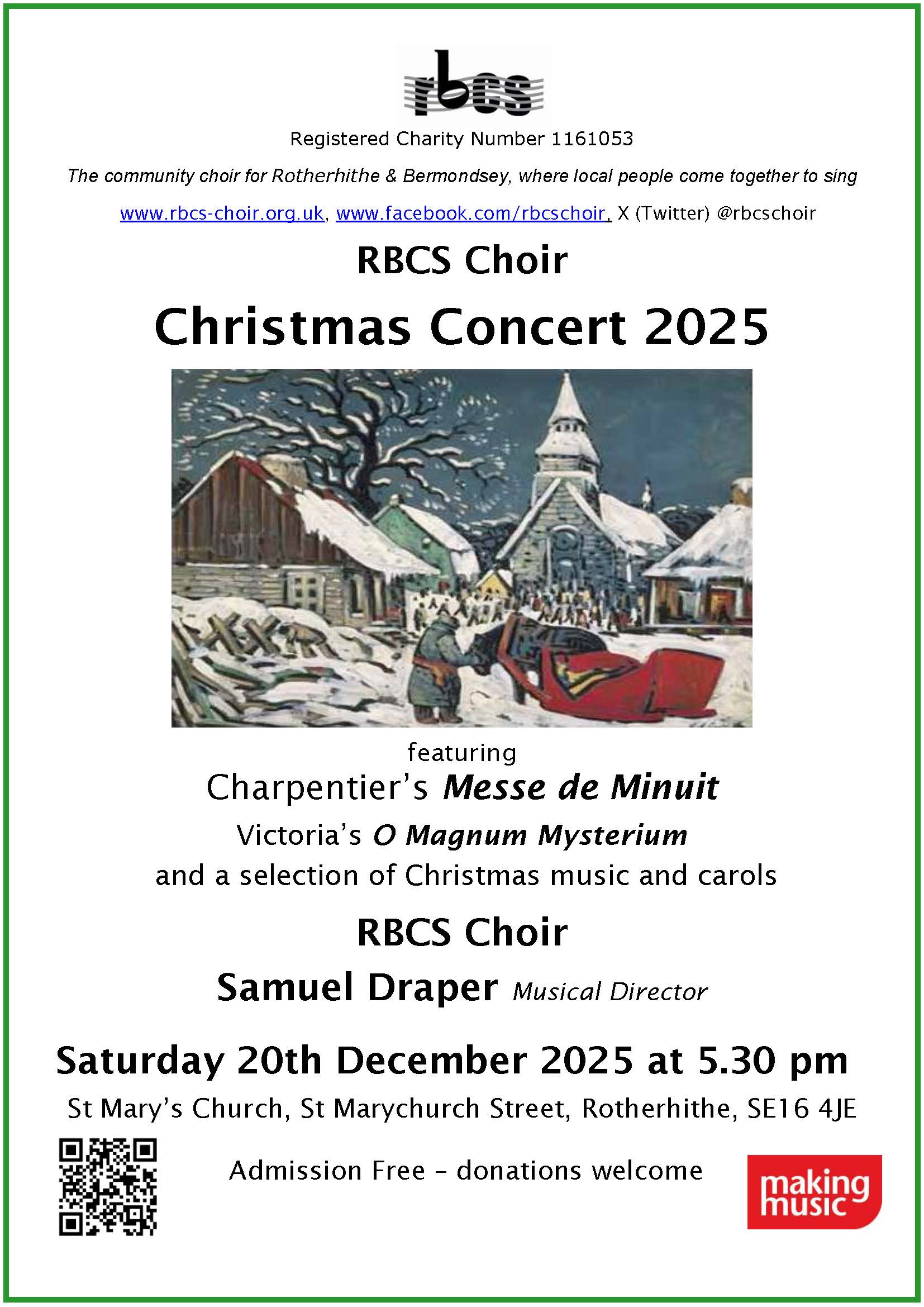 We rehearse from 8.00 to 9.45 pm every Tuesday during school terms at St Mary’s Church, Rotherhithe.
